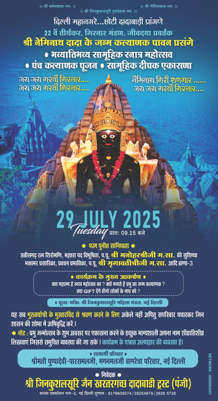 दिल्ली के छोटी दादाबाड़ी प्रांगण में आज श्री जिनकुशलसूरि जैन खरतरगच्छ दादाबाड़ी ट्रस्ट (पंजी) के तत्वावधान में 22वें तीर्थंकर श्री नेमिनाथ भगवान के जन्म कल्याणक के पावन अवसर पर भव्य धार्मिक उत्सव का आयोजन हुआ।