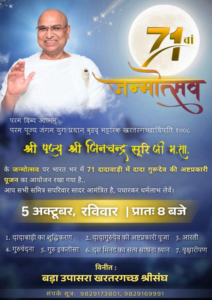 परम दिव्य आत्मन् परम् पूज्य जंगम युग प्रधान वृहद् भट्टारक खर्तरगच्छाधिपति १००८ श्रीमद् आचार्य श्री जिनचंद्रसूरी जी म.सा. का ७१वाँ जन्मोत्सव धूमधाम से मनाया जाएगा।