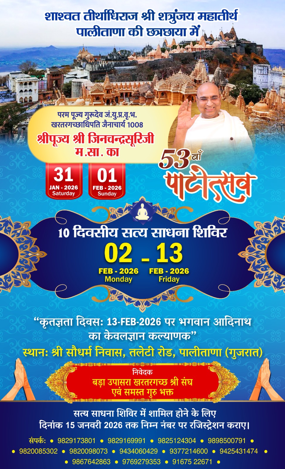 शाश्वत तीर्थधिराज श्री शत्रुंजय महातीर्थ पालीताणा की पावन छत्रछाया में आगामी वर्ष का एक भव्य आध्यात्मिक आयोजन आयोजित होने जा रहा है। खरतलगच्छाधिपति, जैनाचार्य 1008 परम पूज्य श्री पूज्य श्री जिनचन्द्रसूरीजी म.सा. की पवित्र निश्रा में 53वाँ पटोत्सव दिनांक 31 जनवरी 2026 (शनिवार) एवं 1 फरवरी 2026 (रविवार) को आयोजित होगा।