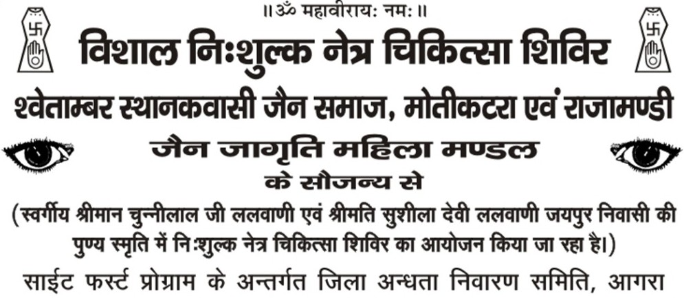आगरा। श्वेतांबर स्थानकवासी जैन समाज, मोतीकटरा एवं राजामंडी जैन जागृति महिला मण्डल के संयुक्त तत्वावधान में विशाल निःशुल्क नेत्र चिकित्सा शिविर का सफल आयोजन आगरा में सम्पन्न हुआ। यह शिविर स्वर्गीय श्रीमान चुन्नीलाल जी ललवाणी एवं श्रीमती सुषीला देवी ललवाणी (जयपुर निवासी) की पुण्य स्मृति में आयोजित किया गया।